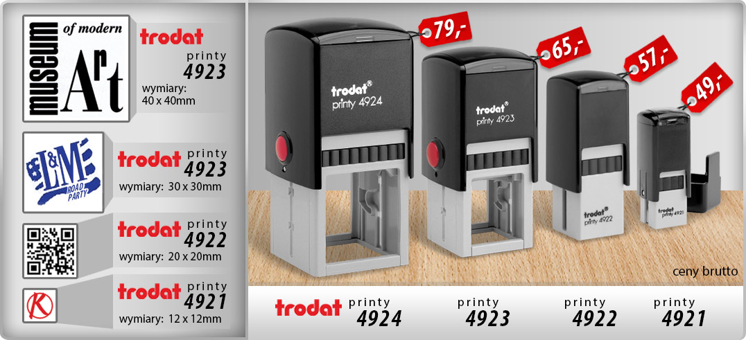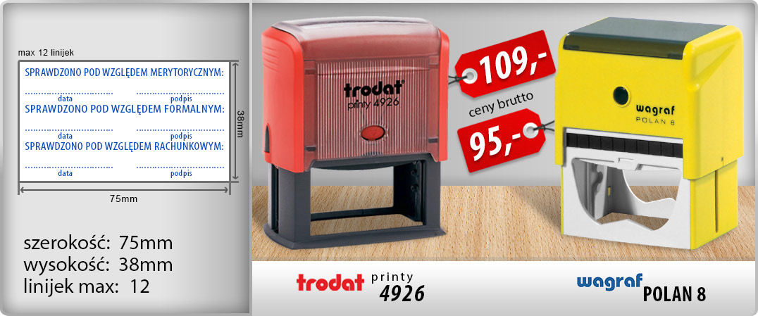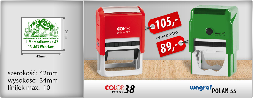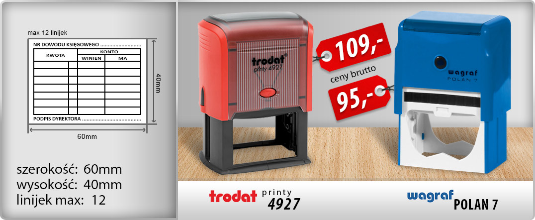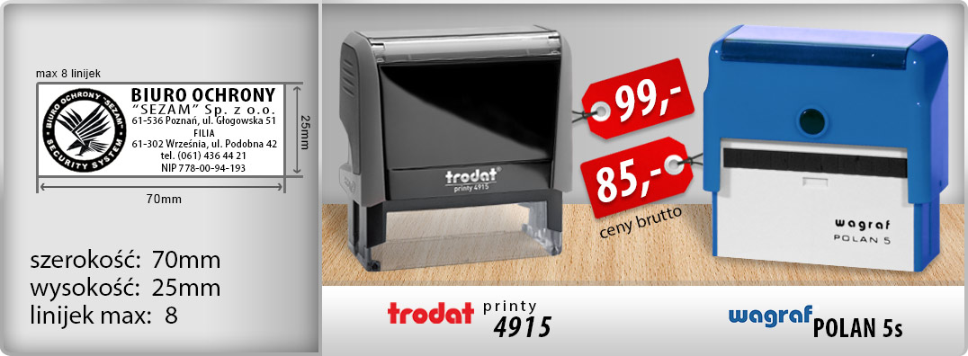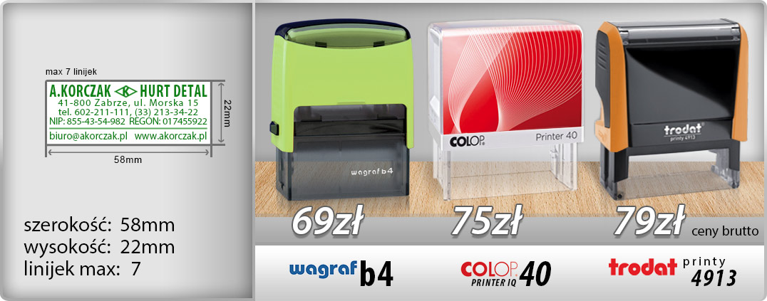 Wagraf b4s, Colop 40 i Trodat 4913 o polu roboczym 58x22mm. Częsty wybór dla większych pieczątek firmowych, faksymil lub innych.