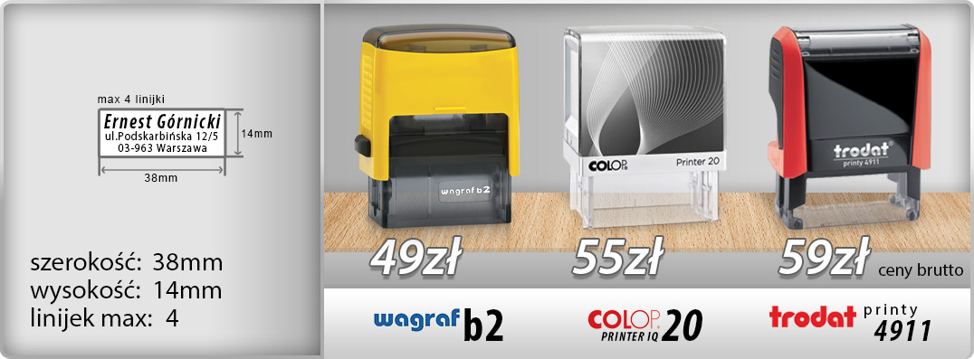 Samotuszujące Wagraf b2s, Colop 20 i Trodat 4911 o polu roboczym 38x14mm. Popularny rozmiar dla odbić imienne lub np. „za zgodność z orginałem”